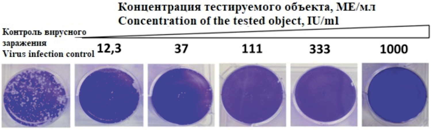 Fig. 1. The results of the analysis of the antiviral activity of the test object: Human recombinant gamma interferon, lyophilisate for the preparation of a solution for intranasal administration 100,000 IU against SARS-CoV-2 in the therapeutic scheme for plaque inhibition.