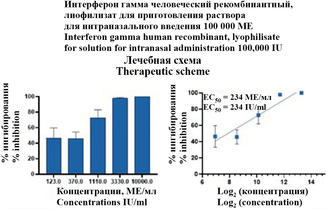 В лечебной схеме применения препарат рекомбинантного IFN-γ обладал противовирусной активностью в диапазоне концентраций от 3333 до 10 000 МЕ/мл, при которых наблюдалось максимальное ингибирование бляшкообразования, близкое к 100%. Полумаксимальная эффективная концентрация тестируемого препарата (ЕС50) при лечебной схеме применения составила приблизительно 234 МЕ/мл.