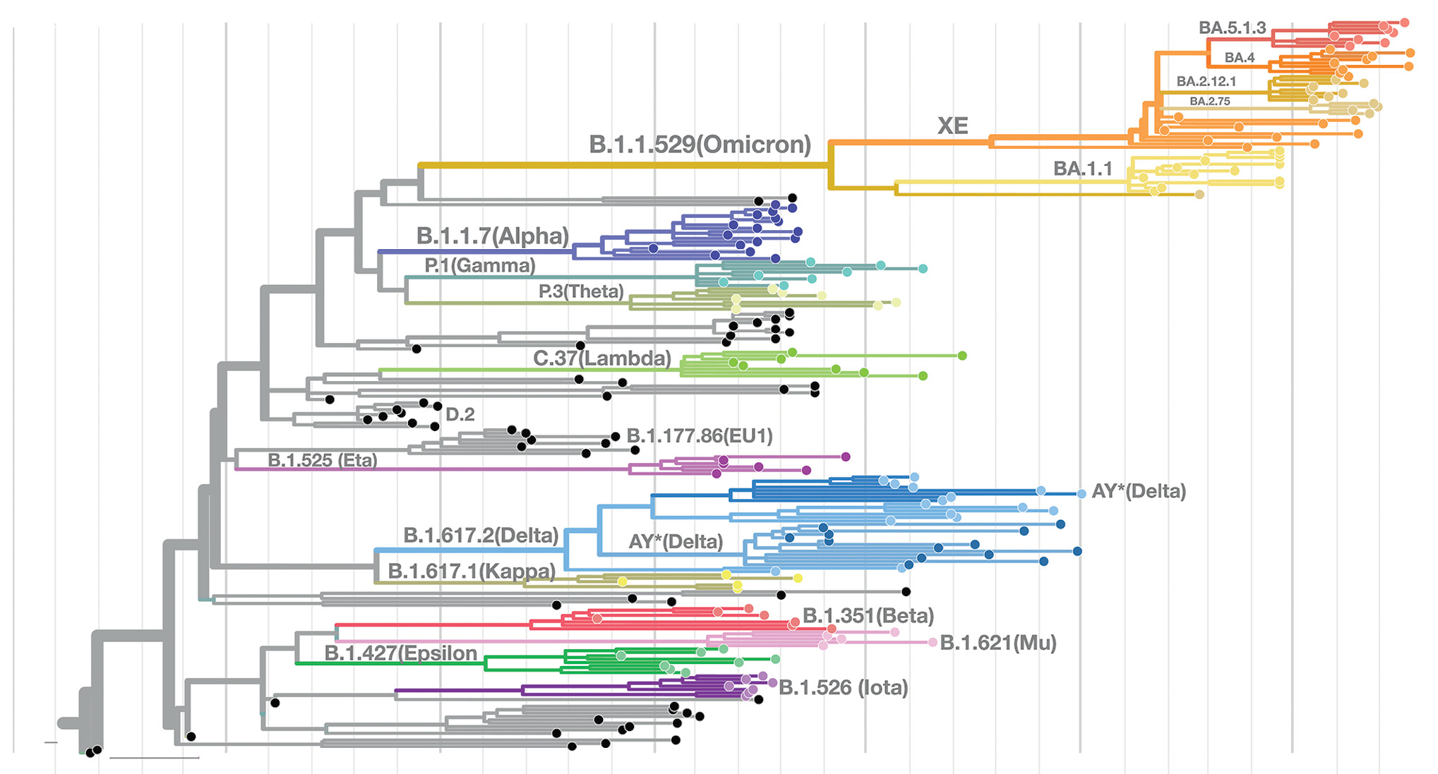 Филогенетическая дендрограмма с использованием метода ML была построена с использованием 196 полных геномов, взятых в открытой базе данных GISAID, включающих референс-штаммы Nextstrain для каждого варианта, а также 31 образец белков вируса S, E, M, N, полученных в лаборатории. Один образец был удалён в силу низкого качества сиквенса. Филогенетический анализ 30 образцов белков S (рецептор-связывающий белок), E (оболочечный белок), M (мембранный белок), N (нуклеокапсидный белок) SARS-CoV-2, полученных в лаборатории, позволил определить 4 клада московских образцов SARS-CoV-2 с высокой статистической поддержкой (PP ≈ 1,0 во всех случаях). В результате субтипирования московских образцов, полученных из ИКБ № 1, удалось выявить наиболее часто циркулирующие варианты и VOC в России и в мире, а именно: альфа (GRY; B.1.1.7 + Q.*), впервые выявленный на территории Великобритании дельта (GK; B.1.617.2 + AY.*), впервые детектированный в Индии, и омикрон (GRA; B.1.1.529 + BA.*), впервые обнаруженный в Ботсване, Гонконге и Южной Африке (рис. 1).