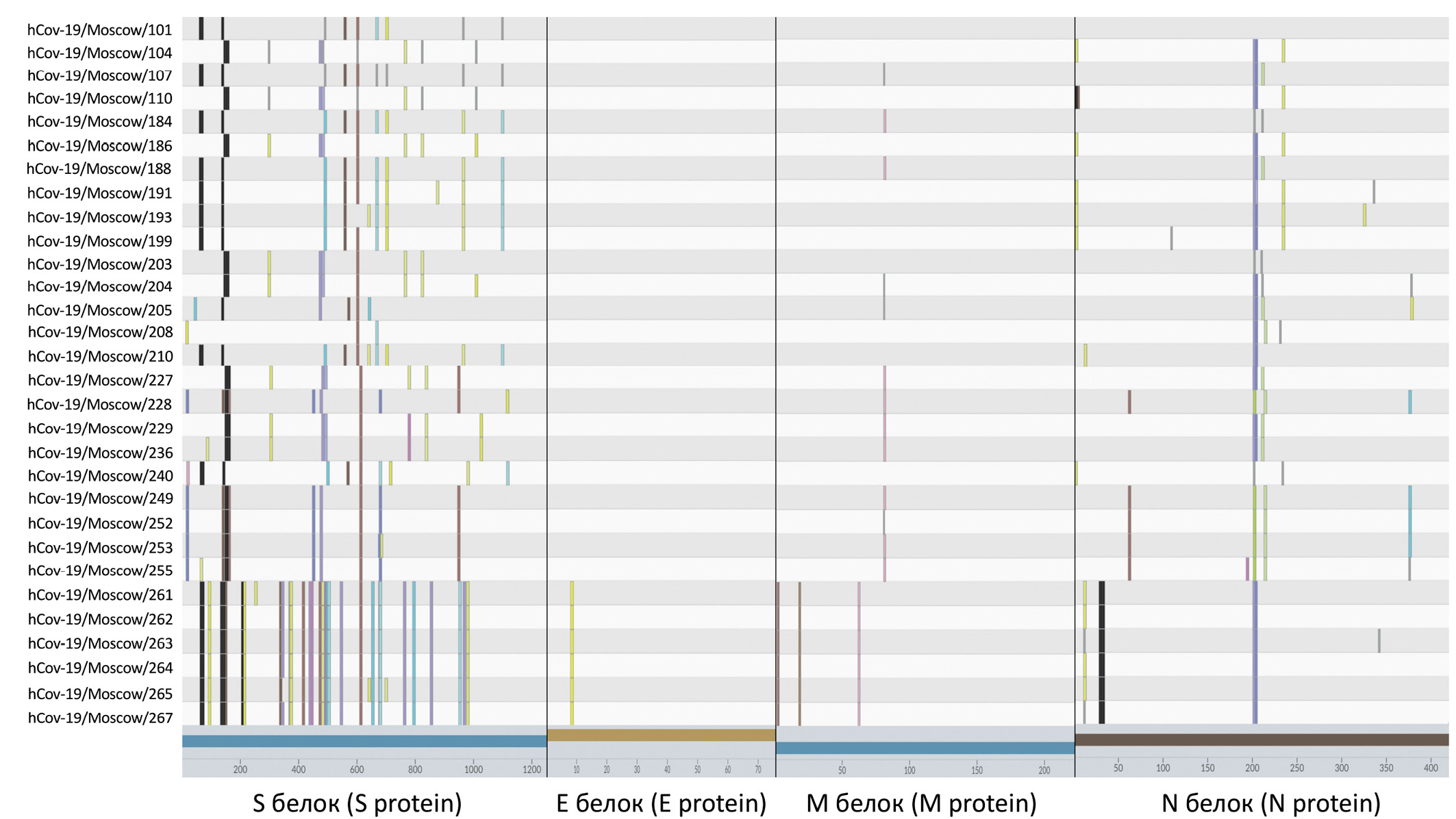 Рис. 3. Частота мутаций в структурных белках SARS-CoV-2 (S, E, M, N) московских образцов из Инфекционной клинической больницы № 1.