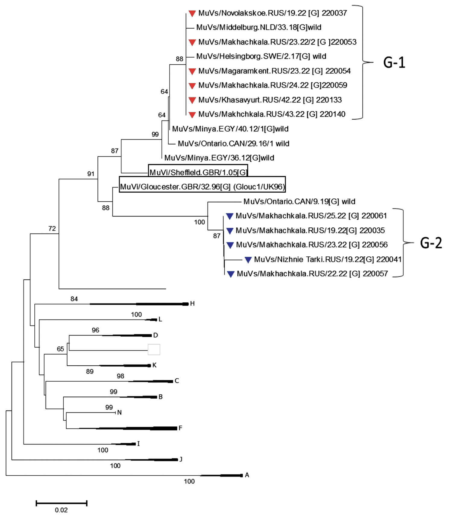 Вторая группа G-2 – более гетерогенная (d = 0,029) и малочисленная, представлена четырьмя нуклеотидными последовательностями. Вирусы, вошедшие в группу, циркулировали на ограниченной территории в мае – июне 2022 г.: её представители зафиксированы в г. Махачкале и п. Нижние Тарки, административно относящегося к г. Махачкале. По данным GenBank, ближайший родственный группе G-2 ВЭП был изолирован в Канаде в 2019 г., однако филогенетически группа G-2 и штамм MuVs/Ontario.CAN/9.19[G] разделены на разные субкластеры. Межгрупповая дистанция между G-1 и G-2 составила 0,08.