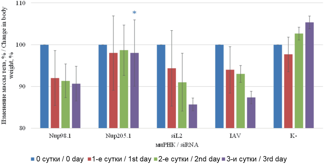 Рис. 2. Влияние комплексов миРНК на изменение массы мышей в течение трёх суток после заражения вирусом гриппа A/California/7/09 (H1N1) в динамике.На оси абсцисс представлены миРНК и их одноимённые целевые клеточные гены. На оси ординат представлено изменение массы тела в (в %). *р ≤ 0,05. Fig. 2. The effect of siRNA complexes on dynamic changes of mice body weight during three days after infection with the influenza A/California/7/09 (H1N1) virus. The X-axis shows siRNAs and respective target cellular genes of the same name. The Y-axis shows the changes in body weight, expressed (in %). *р ≤ 0.05.