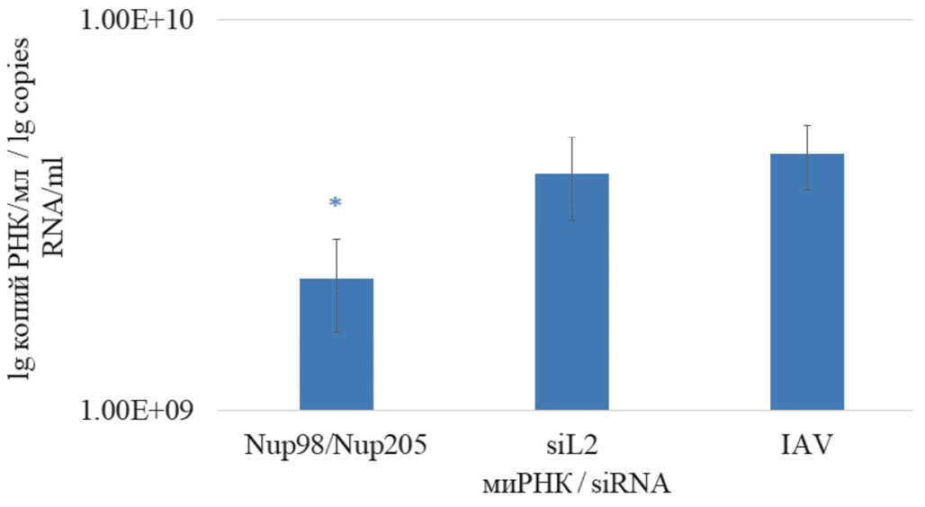 Рис. 6. Влияние подавления генов Nup98 и Nup205 посредством миРНК на изменение вРНК на третьи сутки с момента трансфекции при LD50.По оси абсцисс – названия миРНК. По оси ординат представлено количество вРНК. *р < 0,05. Fig. 6. Effect of siRNA suppression of Nup98 and Nup205 genes on concentration of viral RNA on the third day after challenge with LD50. The X-axis shows the names of siRNAs. The Y-axis shows the concentration of viral RNA. *p < 0.05.