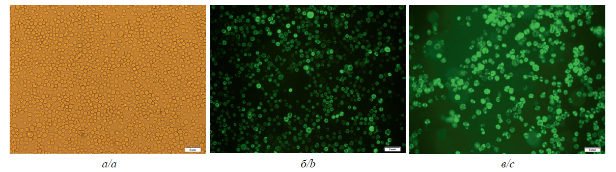 Рис. 1. Результат трансфекции линии клеток Sf-9 бакмидной ДНК, содержащей гены белков РВА VP6 и VP2-eGFP: а – незараженная культура клеток Sf-9 в проходящем свете; б, в – культура клеток Sf-9, зараженная рекомбинантным бакуловирусом 1-го (б) и 3-го (в) пассажа соответственно в флуоресцентном поле.
