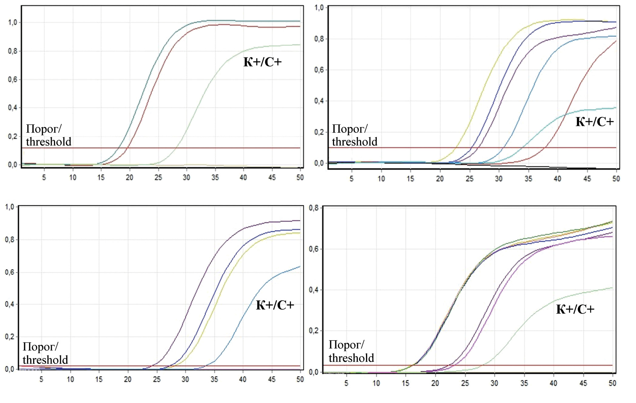 Рис. 1. Результаты диагностики образов от людей, погибших после укусов рукокрылыми, и материала от диких хищников в ПЦР Real-time с набором реагентов для выявления РНК вируса бешенства от ООО «Синтол» по каналам детекции специфики: Yellow: а – человек, Амурская область, 2019 г.; б – человек, Приморский край, 2019 г.; в – человек, Приморский край, 2021 г. и Orange: г – хищные млекопитающие, Амурская область, 2019 г. Кривые на иллюстрациях а, б, в, г соответствуют положительным реакциям для образцов биоматериала. К+ – положительный контроль реакции. По оси Х указана нормальная флюоресценция. По оси Y указано ко-во циклов.