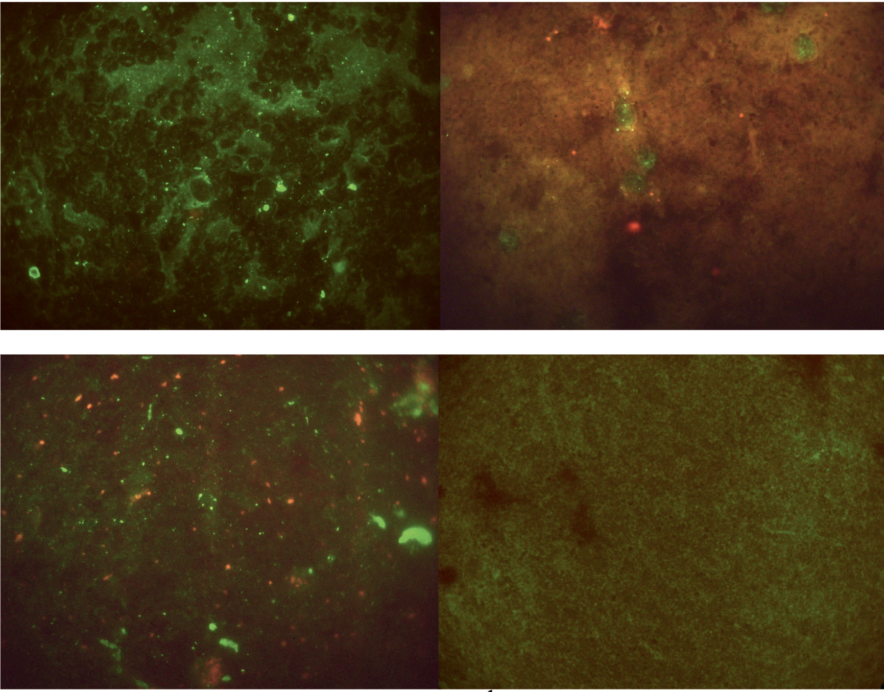 Рис. 2. Специфическая иммунофлуоресценция антигена лиссавирусов бешенства в отпечатках головного мозга, полученная методом флуоресцирующих антител с использованием поликлонального Ig (ФГБУ «ВНИИЗЖ»). Отпечатки сделаны с первичного материала (головной мозг): а – человек, Амурская область, 2019 г.; б – человек, Приморский край, 2019 г.; в – человек, Приморский край, 2021 г.; г – здоровые белые мыши. Микроскоп Olympus CX41, окуляр ×10, объектив ×100, система документирования DP 72, масляная иммерсия.