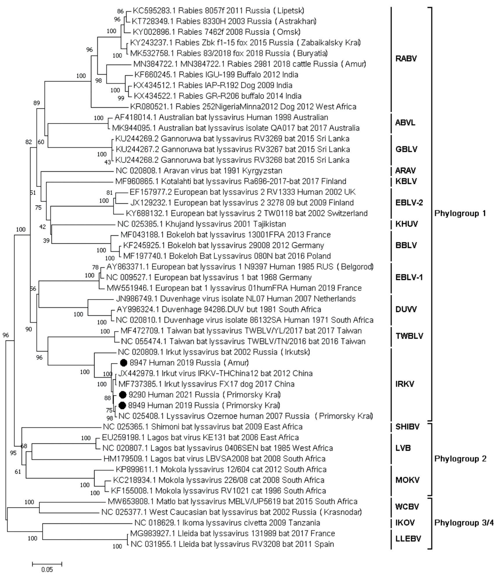 Results. The viruses that caused the fatal cases in humans in the Amur Region and Primorsky Krai share more than 90% identity to Lyssavirus irkut detected in Russia and China. Together they form a separate monophyletic cluster with 100% bootstrap support.