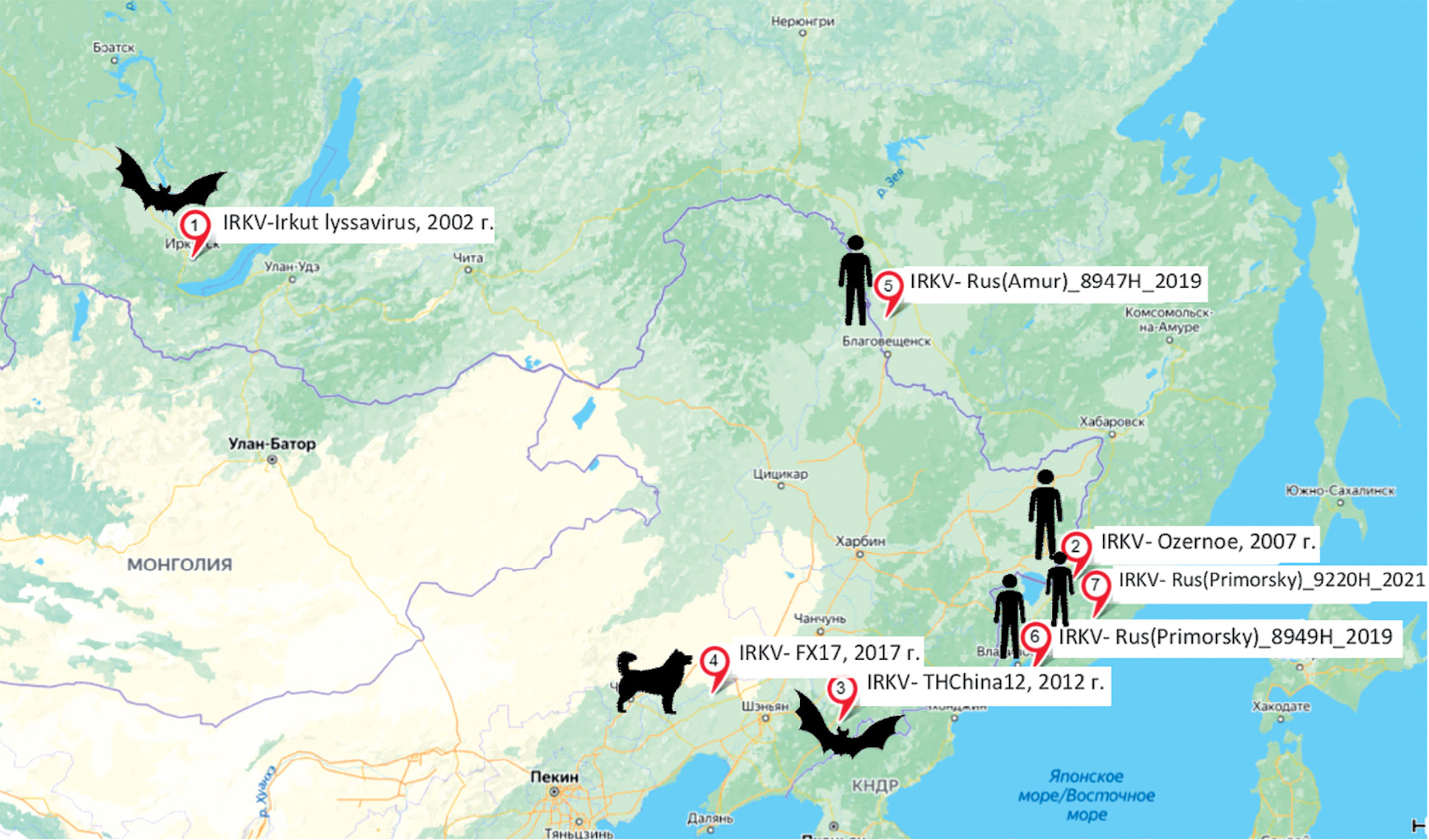 - During 1977–2021, seven human deaths from bat bites were reported in Russia: two deaths were reported in the Lugansk People’s Republic, Lugansk (Voroshilovgrad) and Molodogvardeisk; one death – in the Belgorod Region, Belgorod; one death – in the Amur Region, Blagoveshchensk; three deaths – in the Primorsky Territory, Ozernoe village, Fokino, Zavetnoe village.